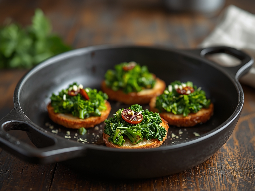For a vegetarian twist, use vegetable broth instead of chicken broth. To add some protein, top the crostini with crumbled Italian sausage or crispy pancetta. For a cheesy variation, sprinkle with shredded mozzarella cheese before baking the crostini. In the fall, you can use roasted butternut squash instead of broccoli rabe for a seasonal take on this Italian crostini appetizer. You might also prefer Cheesy Broccoli Bites for a completely new flavor dimension.