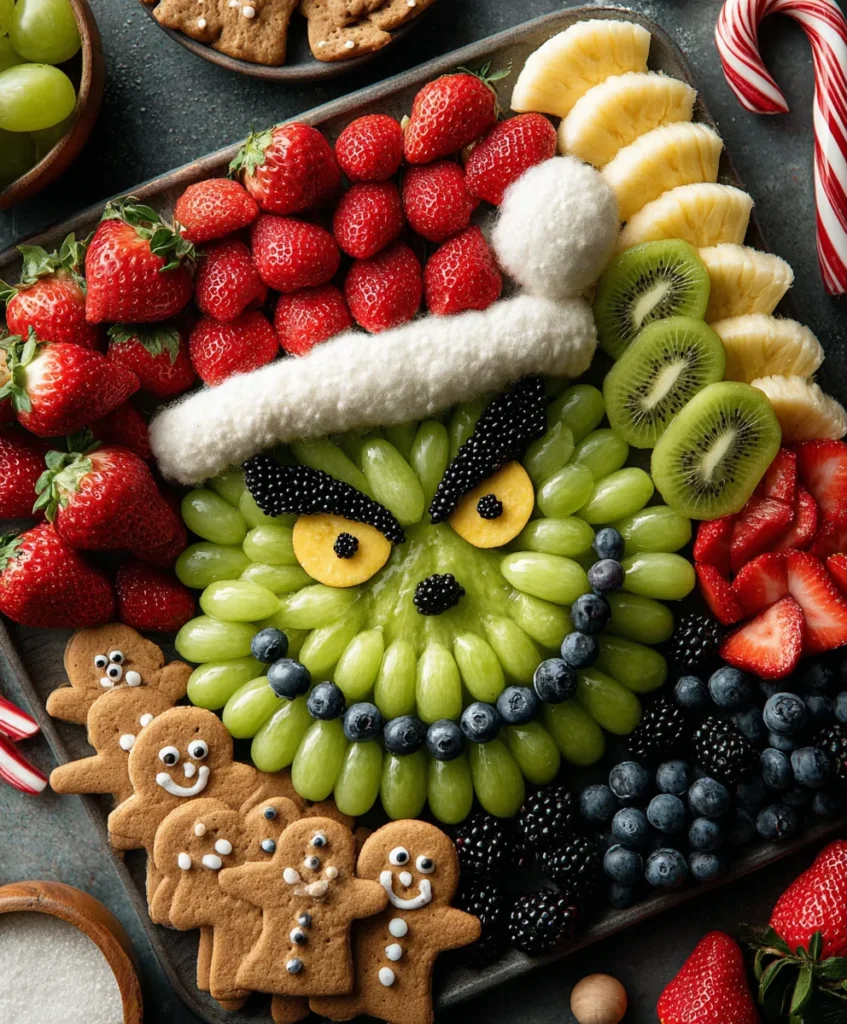 • The cute Grinch face crafted with fruits and candy eyes brings the wow factor to any table.