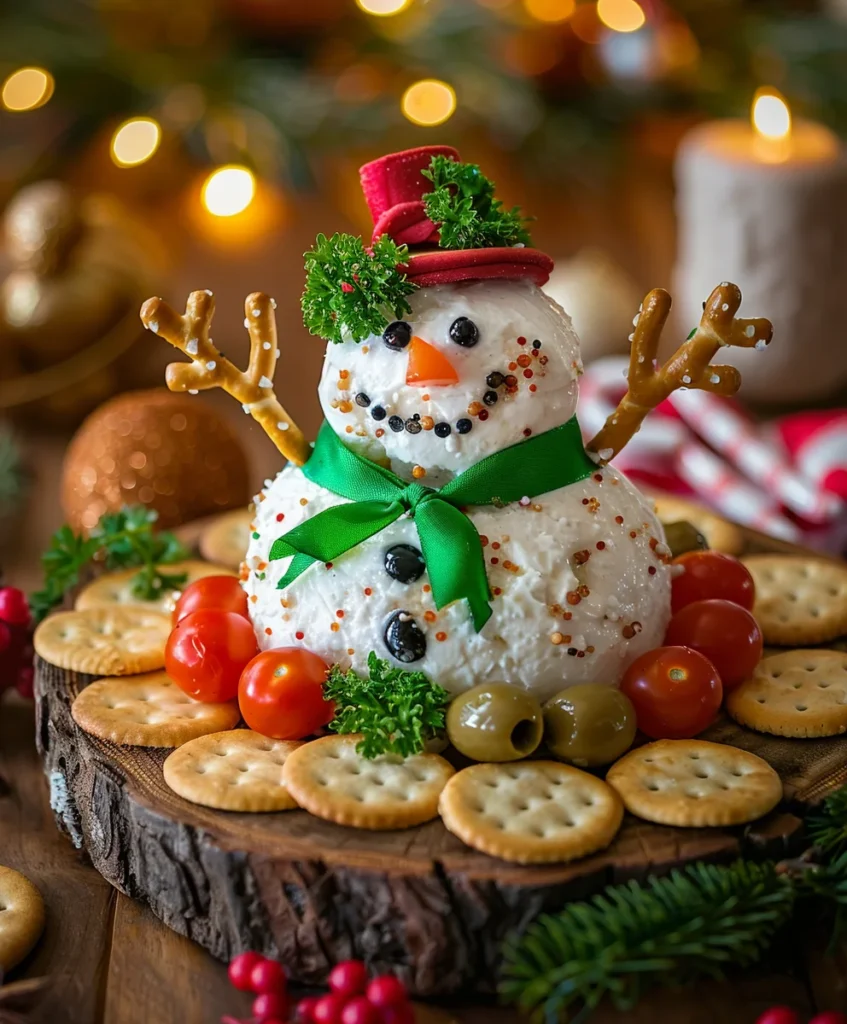 Yes! You can definitely prepare this recipe ahead of time, which makes holiday hosting so much easier. Simply shape the two cheese balls a day before your event, wrap them tightly in plastic wrap, and refrigerate them so they stay firm and fresh. When you’re ready to serve, remove the wrap, assemble your snowman, and add the decorations just before placing it on the table. This keeps the carrot nose bright, the peppercorn eyes secure, and the pretzel arms crisp, giving your snowman the cutest and freshest look possible.
