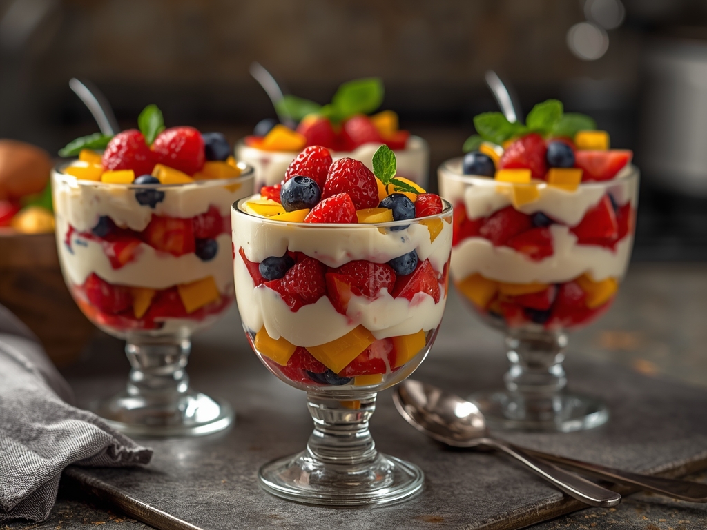 A vibrant and refreshing parfait layered with colorful fruits, creamy Greek yogurt, and a touch of honey. The perfect healthy breakfast, snack, or dessert!