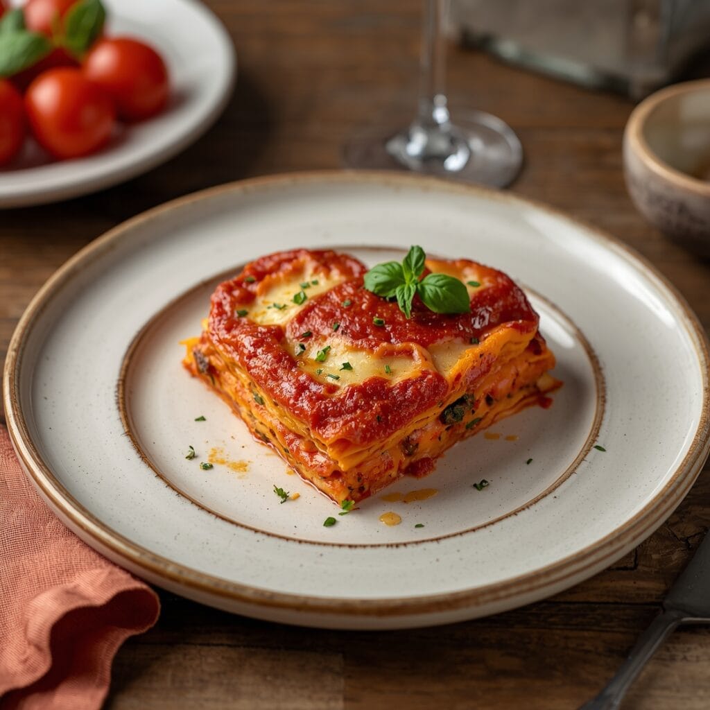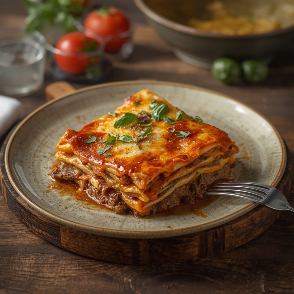 Traditional beef lasagna is a comforting classic made with tender pasta layers, rich beef sauce, creamy béchamel, and melted cheese, perfect for family meals.
