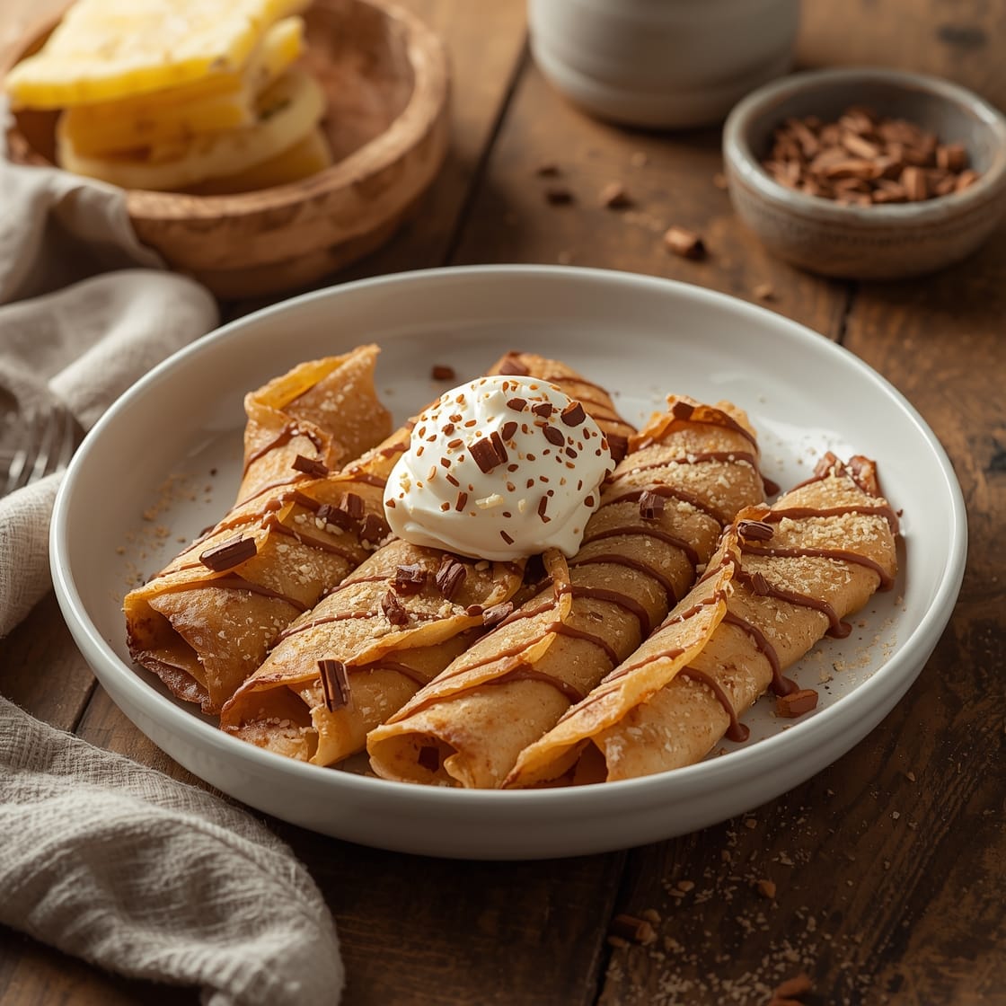 For a chocolate version, add a tablespoon of cocoa powder to the crepe batter and sprinkle chocolate chips into the cinnamon filling.