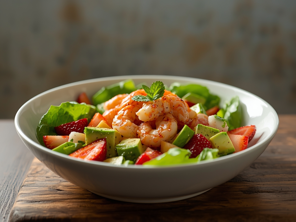 A refreshing and vibrant salad featuring sweet strawberries, creamy avocado, succulent shrimp, and fresh spinach, tossed in a tangy balsamic vinaigrette.